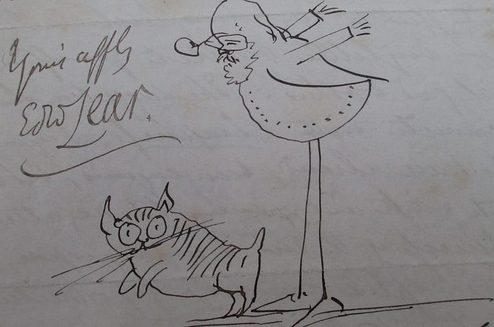 Yet something deeper lurks beneath the silliness. Lear's nonsense isn't simply childlike, it creates a bridge between childhood and adulthood. He famously sent "nonsense letters" to both children and adult friends, casting himself as a character who "chats with slugs, clings to wild sheep horns in Crete, or dangles in conversations with frogs." These letters, Lodge argues, "open up a channel of communication between the child-self and the adult-self." They seem to whisper: come back. Return to the version of yourself who once trusted the fantastical, whose imagination knew no bounds.